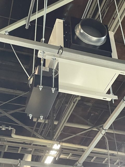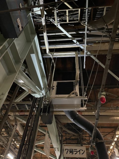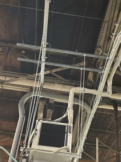 天井の高い工事に設置した為、吊りの仕込みや機械のぶれ止め、ドレンの排水方法など色々考えながらの設置工事でした。